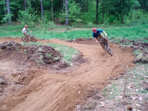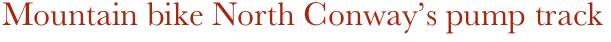 This pump track was located in North Conway, a resort town in New Hampshire's White Mountains. Armed with rakes, shovels and other tools, about 20 avid mountain bikers from middle school students to the retired crowd spent a morning building the pump track on a small tract of land by the Green Hills Preserve which is an area mountain biking hot spot. The track is located next to the Sticks and Stones Trail which isn’t far from North Conway Village. From Route 16 or North-South Road, travel on Artist Falls Road to the trailhead on Thompson Road.