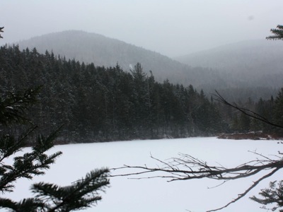 Sitting behind the Appalachian Mountain Club's Highland Center is the tiny four-acre Ammonoosuc Lake in Crawford Notch. Surrounded by spruce and fir and well within ear-shot of the passing trucks on Route 302, the little lake is encircled by the fairly easy Around-the-Lake Trail. But that is not the only surprise awaiting in the woods. A spur called the Red Bench Trail leads to a hidden red bench, a fine spot for watching the snow fall and a place to return on a clear day.