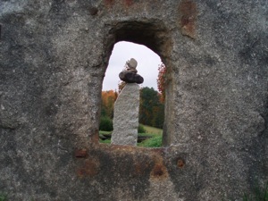 Two stones topped with cairns separated by a large circular rock show union with a path leading to benches for family. One of life's monumental choices is parenthood and for those who don't have children a branch path leads to two stones: a niece and a nephew.