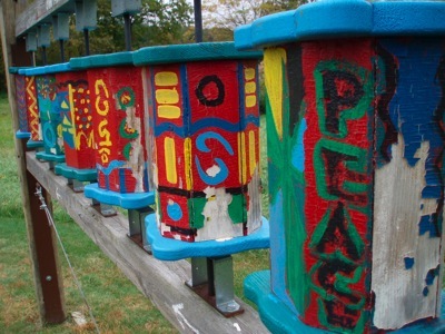 A circle of Easter Island-esque statues represent community while a path to a single stone under trees conveys solitude. Some climb the hill of ambition, near a trio of McDonnell's beehives, while others walk around it. A stark teepee embodies sorrow. Tall birches transported from Georgia and surrounded by raspberry and blueberry bushes to munch in season encapsulate forgiveness in a tranquil setting.